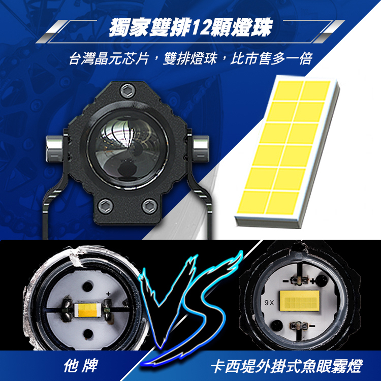 卡西堤採用比市售其他品牌多一倍的雙排12顆燈珠,魚眼透鏡也達到完美的切線光型不怕影響對向來車。